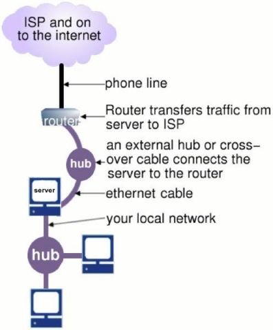 Typically, your ISP will arrange for and configure your external hub and router. Alternatively, you may be required to install that hardware yourself under their direction. If a special phone line is required, the ISP will typically arrange that. It is most typical with corporate service that you receive a routable, static IP address. In fact, usually you will be allocated a block of routable, static IP addresses for your corporation - you will need only one for your server.