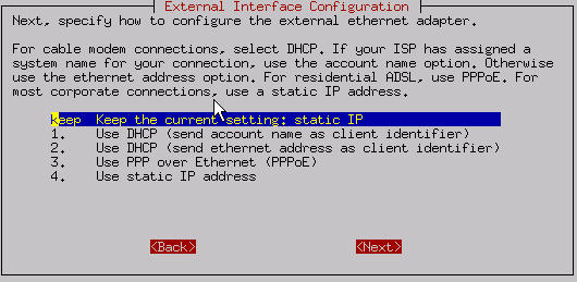 If you have a static IP address and your ISP is configuring your server using DHCP or PPPoE, select Option 1, 2 or 3 depending upon how you will be connecting to your ISP. When you first connect to your ISP, your server will automatically be given its external interface configuration parameters.