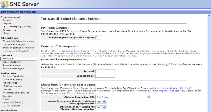 Der Server-Manager ist per SSH, PPTP, oder auch über SSL per Fernzugriff erreichbar, wenn der Server in der Sektion Sicherheit und Register Fernzugriff richtig konfiguriert wird.