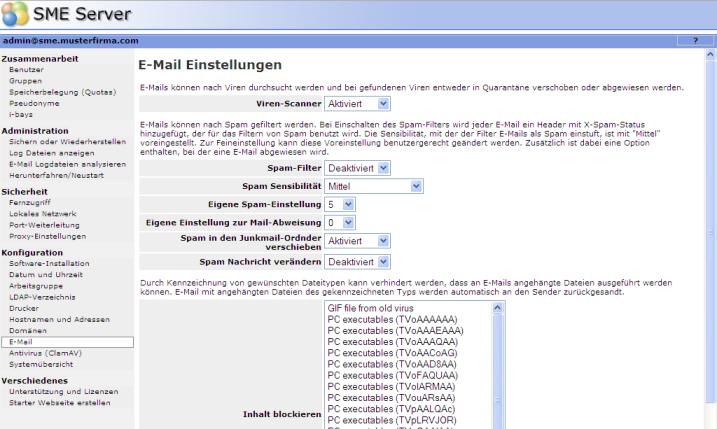 Der SME-Server unterstützt die Möglichkeit, E-Mails auf Viren zu untersuchen und als Spam einzustufen. Zusätzlich können ausgesuchte Typen von Dateianhängen gezielt ausgeschlossen werden.
